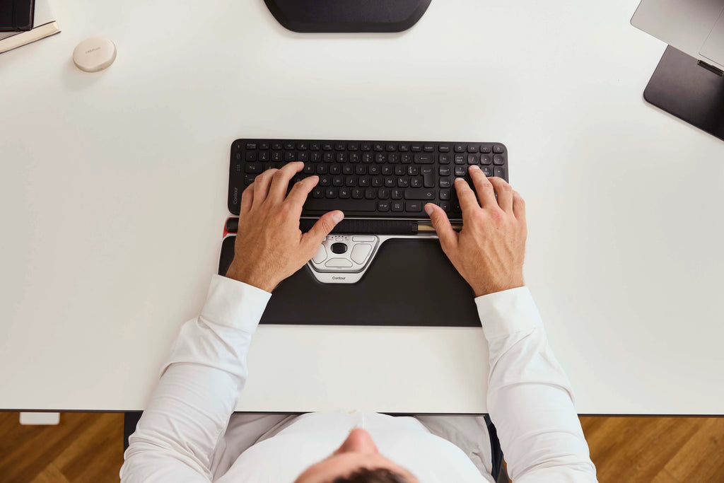 The Contour RollerMouse is a centrally positioned pointing device designed to keep cursor control directly in front of the keyboard, eliminating the need to reach for a traditional mouse. This inline placement supports a more natural working posture and helps reduce strain on the hands, arms, shoulders, and neck.