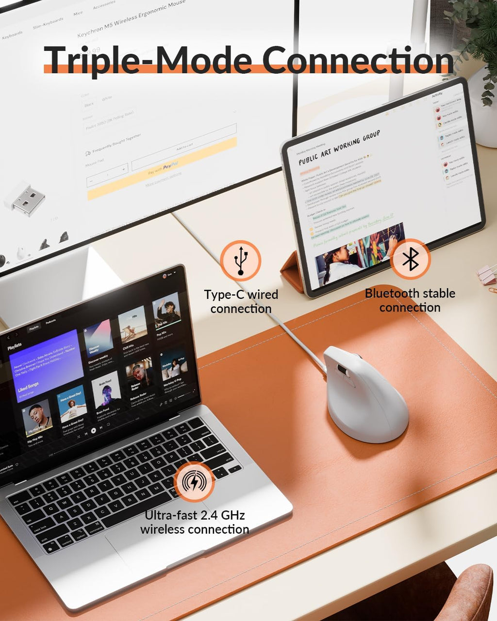 • Conventional horizontal (flat) mice force your forearm to twist away from its natural position, contorting muscles and soft tissue into awkward positions. This can lead to discomfort, pain, and increased fatigue. The Keychron M5's vertical orientation keeps your wrist in a natural position, promoting better circulation and reducing fatigue.